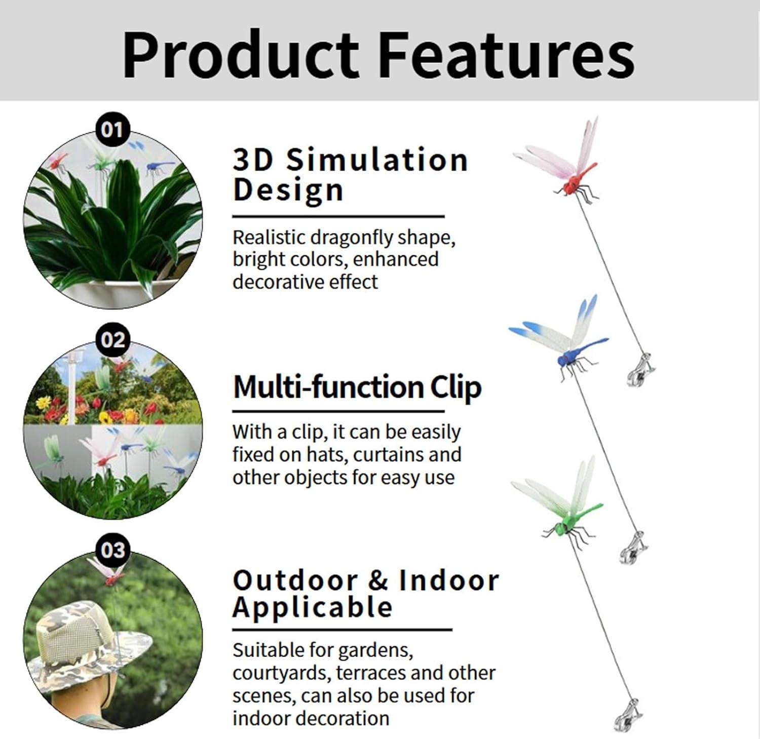 - Dual - Function Pest Deterrent: Serves as both a decorative element and an effective pest repellent. The realistic 3D dragonfly design mimics natural predators, scaring away birds, flies, and other unwanted insects indoors and outdoors, protecting your garden, patio, or even hats from pesky critters.