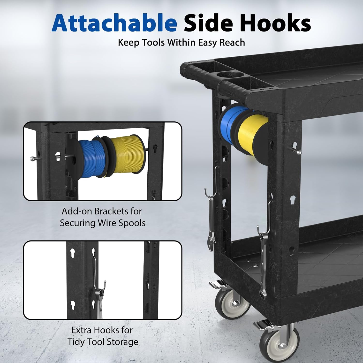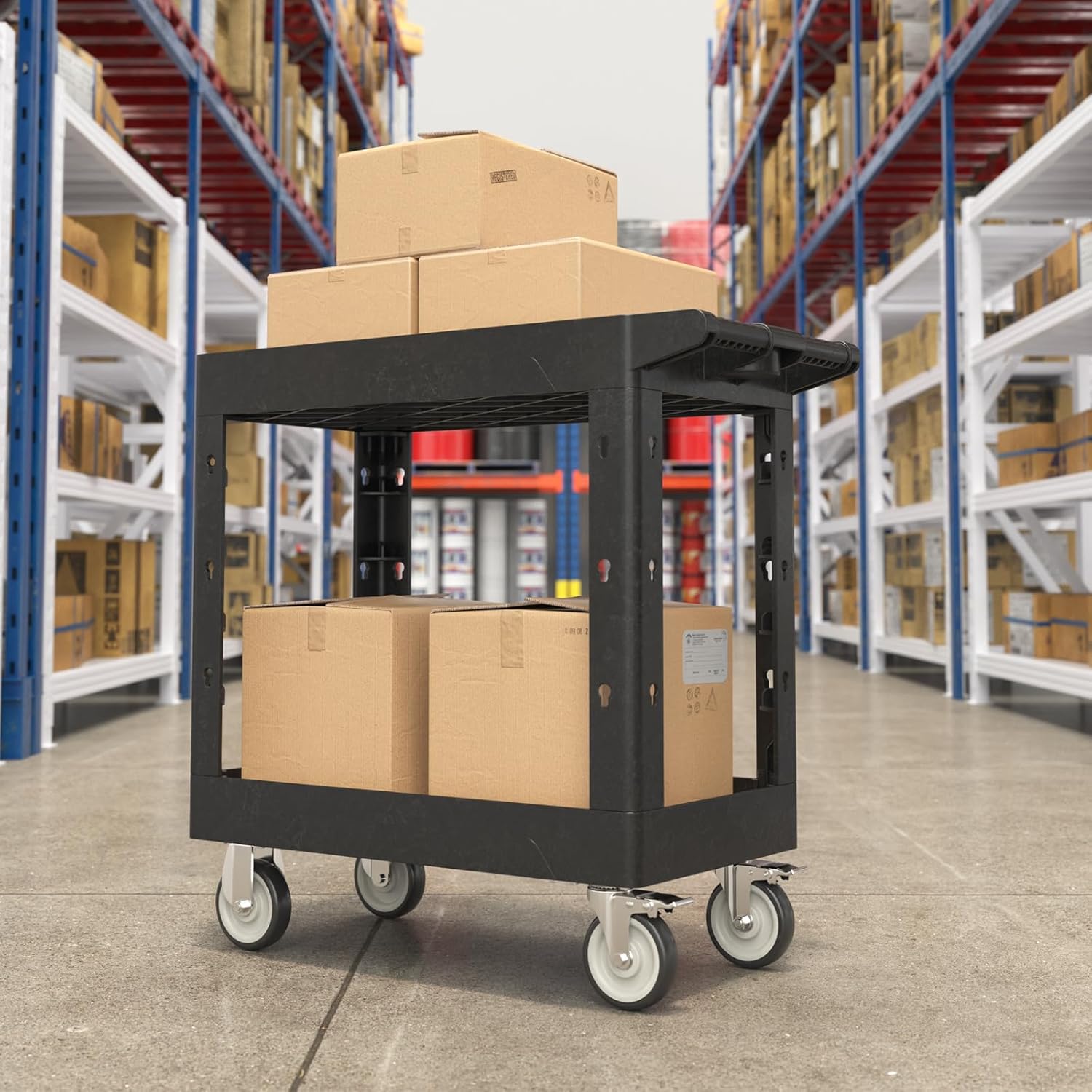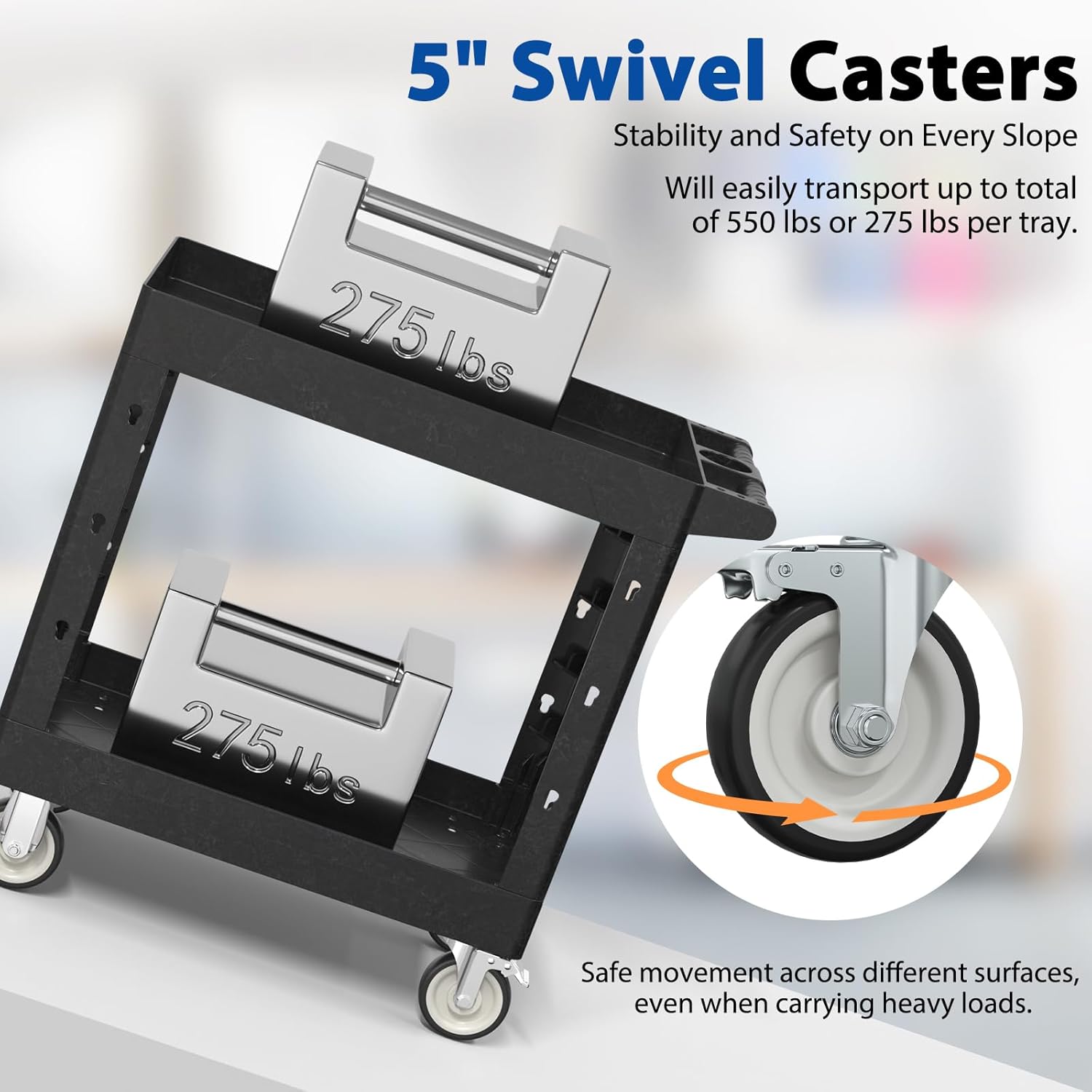 Heavy Duty Rolling Utility Cart with Wheels 2 Tier Utility Plastic Service Work Cart for Shop, Garage, Warehouse, Maintenance 550 lbs