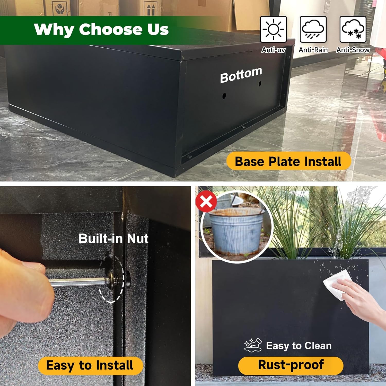 Galvanized Steel Metallic Heavy Planter for Outdoor Plants Metal Outdoor Planter Spliced Flower Box with Partitions for Outside,Indoor,Garden (Black, 36 * 15 * 24)