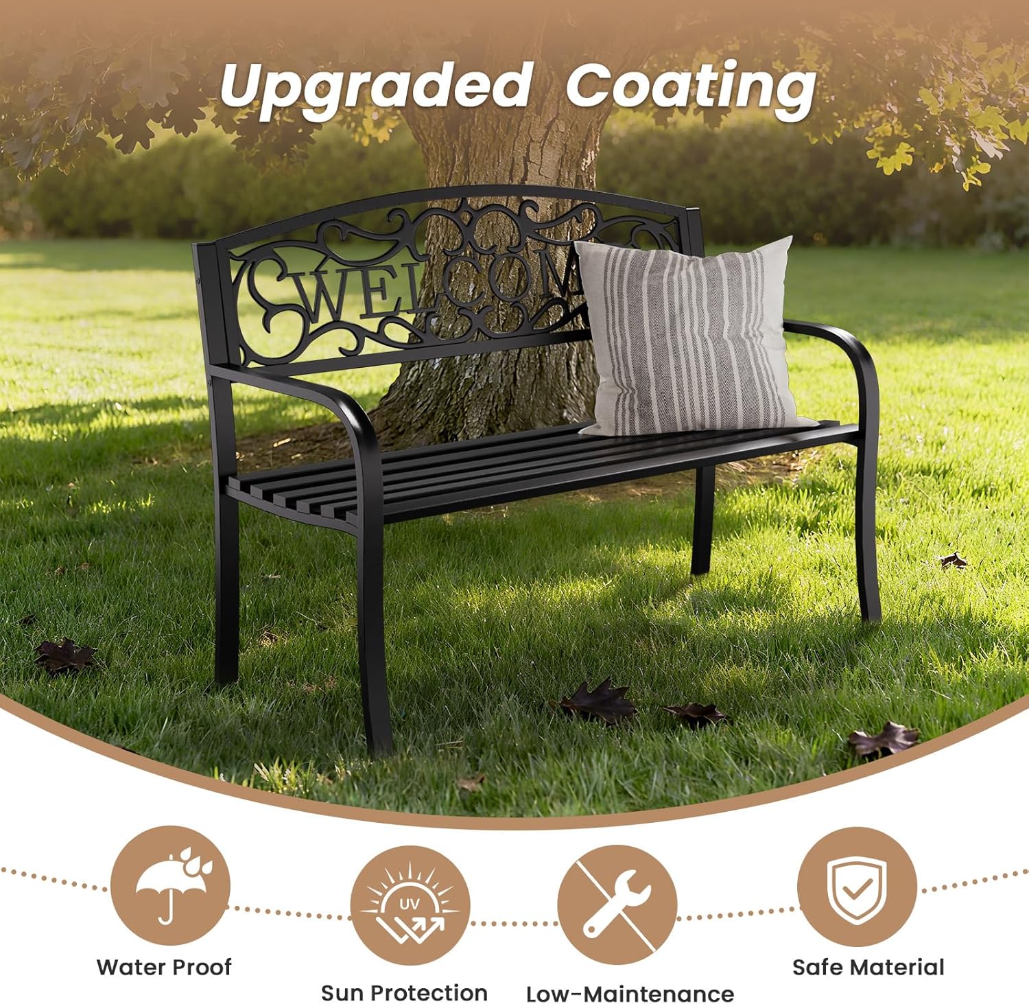- 【Excellent Metal bench】Unlike fragile wood, this outdoor bench is made of reinforced iron which has excellent sturdiness and stability allow it to support 550lbs and use for years.The garden benches for outdoors applying to lots of areas, such as garden, park, patio, front porch, entryway.