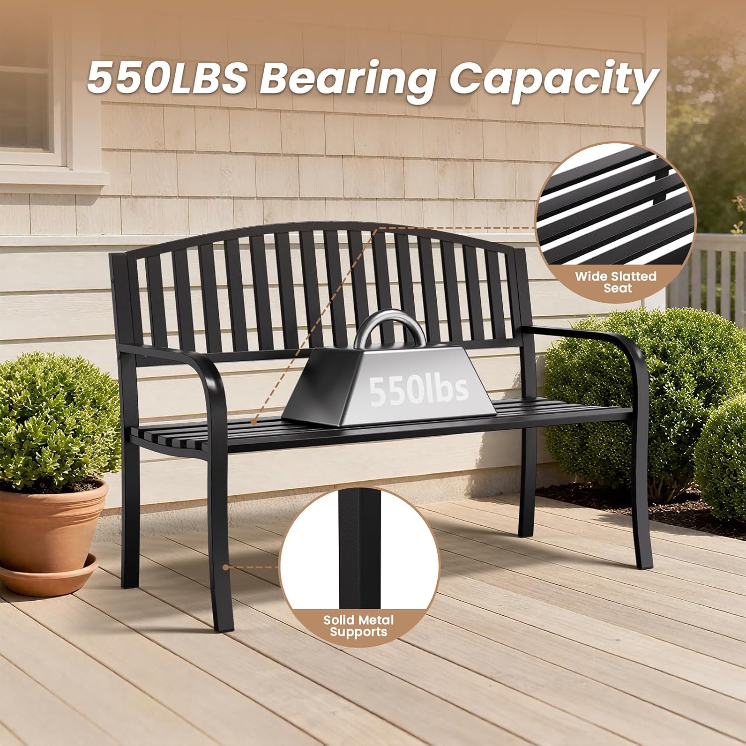 - 【Excellent Metal bench】Unlike fragile wood, this outdoor bench is made of reinforced iron which has excellent sturdiness and stability allow it to support 550lbs and use for years.The garden benches for outdoors applying to lots of areas, such as garden, park, patio, front porch, entryway.