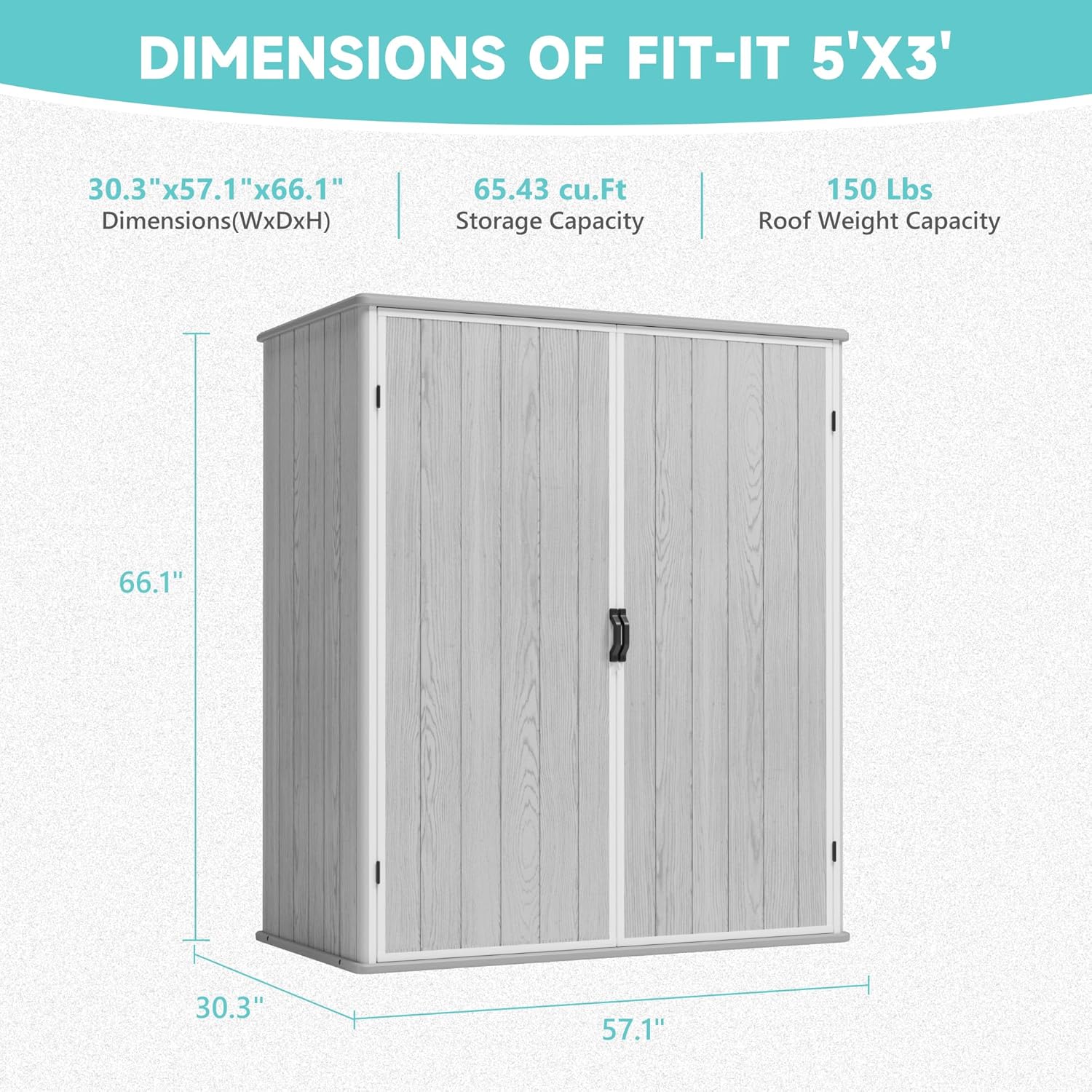 - Spacious 5x3FT Capacity: Generous storage space with dimensions: 30.3"D x 57.1"W x 66.1"H. Ideal for organizing lawnmowers, bikes, patio furniture, and more while keeping them protected from the elements.