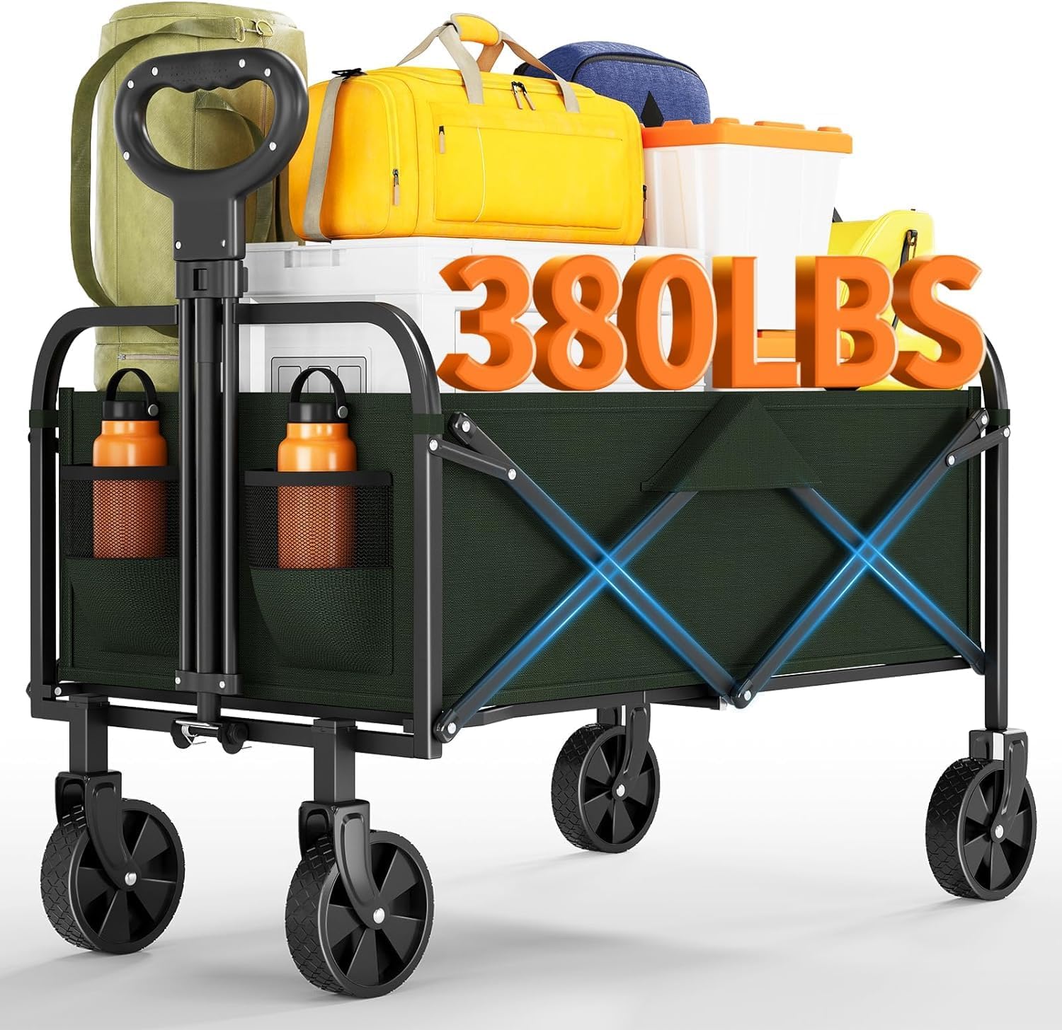 Foldable Wagon Cart, 380LBS Capacity Collapsible Wagon with All-Terrain Wheels, 220L Foldable Utility Cart & Grocery Cart on Wheels, Portable Lightweight 12LBS for Outdoor, Beach, Garden (Green)