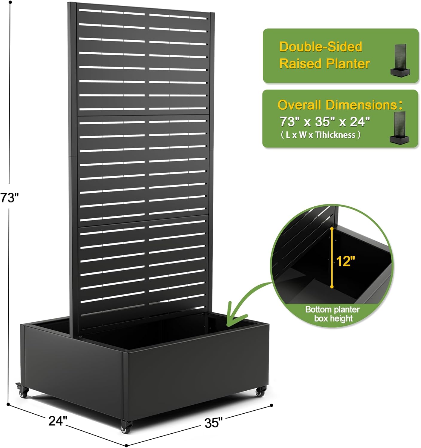 FENCY Dual Planter Boxes Metal Raised Garden Bed with Wheels and Trellis, 73"x35"x24" Privacy Screen for Vegetables, Vines & Flowers, Includes Drainage Holes