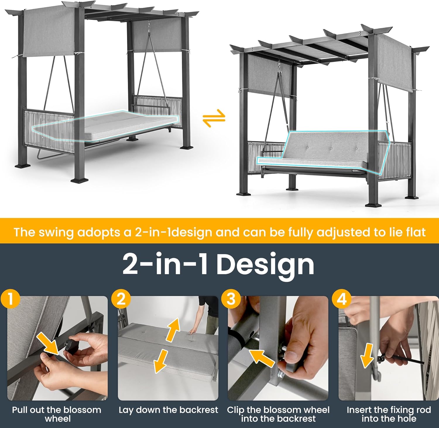 - 3-Seat Porch Swing Bed: This 2 in 1 swing can be transforms from a patio swing chair into a swing bed by removing a support pole. Combines the elegance of a pergola with the comfort of a swing, it offers the perfect way to outdoor. You can sit with friends for relaxing or lying down for a nap on it